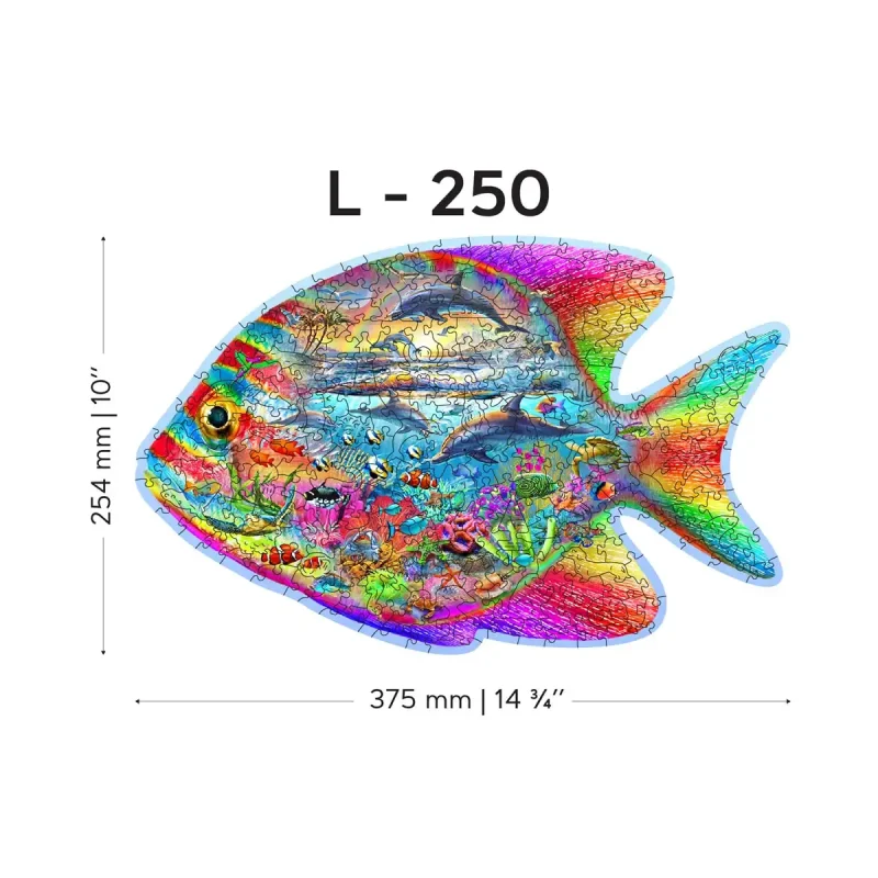 Cette création capture un poisson rayonnant, au sein duquel se déploie un panorama marin vibrant. À mesure que les pièces s’assemblent, la mer scintillante révèle une multitude d’espèces aquatiques : des tortues glissant avec grâce, des dauphins émergeant au coucher du soleil, et un assortiment vivant de poissons jouant parmi les coraux et les algues. Par-dessus tout, un arc-en-ciel éclatant ajoute une touche de fantaisie à cette tapisserie aquatique.