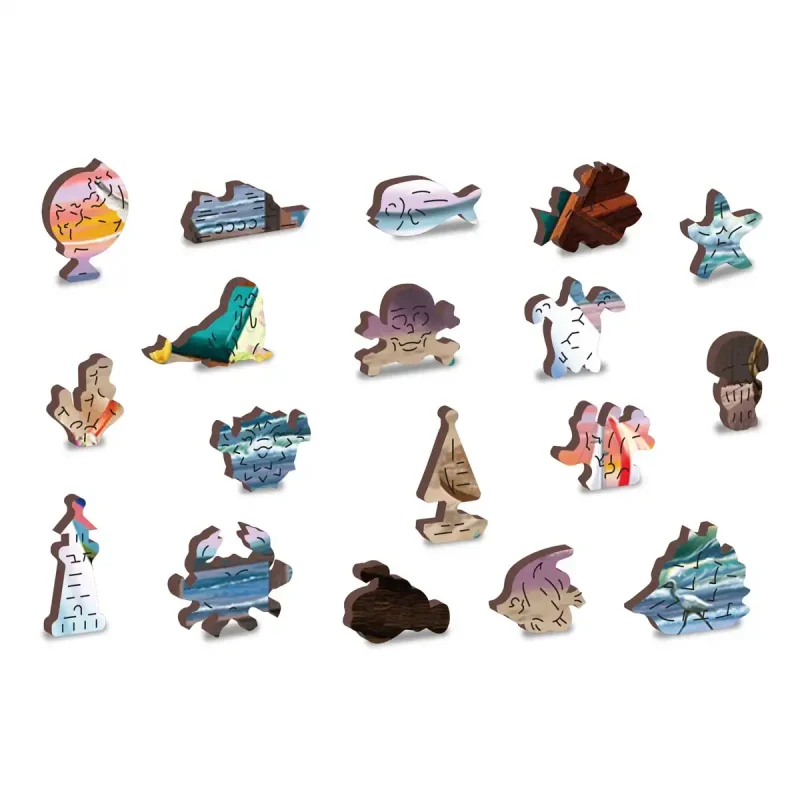 Ce puzzle en bois dévoile une soirée romantique au bord de la mer. En commençant l’assemblage, un yacht navigue gracieusement sur l’eau, des oiseaux marins se promènent sur le rivage, et l’atmosphère sereine du gazebo en bois prend vie.
