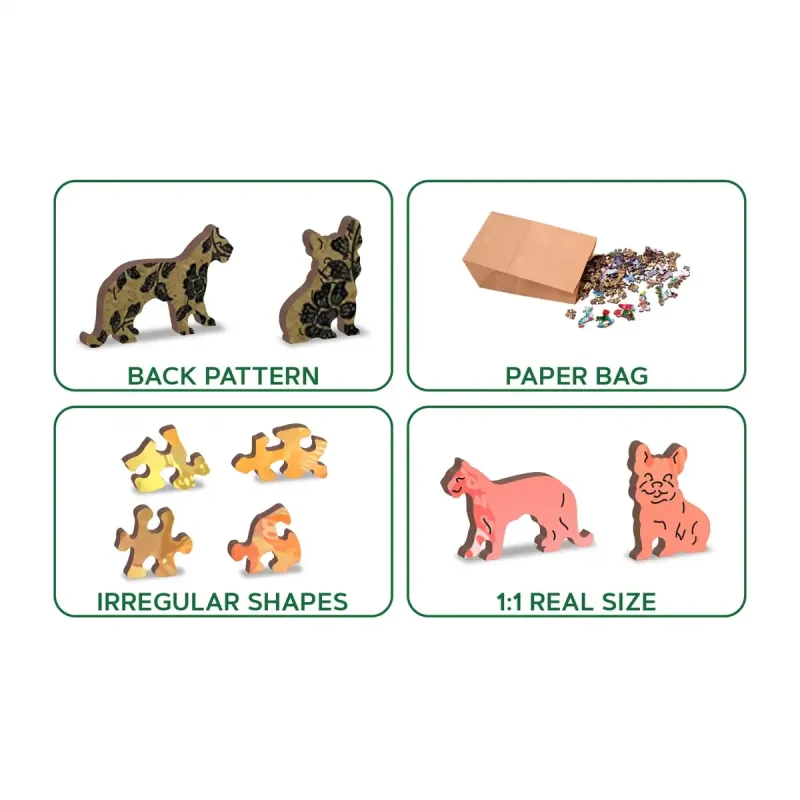 Pour faciliter votre voyage d’assemblage, chaque pièce est recto-verso. Le verso présente un motif unique, offrant à la fois une assistance et un soupçon de défi. C’est comme naviguer à travers deux mondes en une expérience.